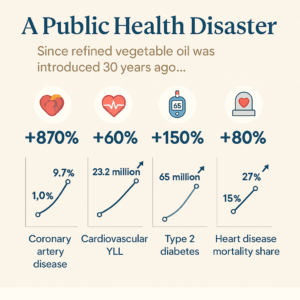 These alarming increases in CAD, cardiovascular mortality, and diabetes closely parallel the promotion and adoption of refined seed oils, processed foods, and the industrialized diet in India. The switch from traditional, minimally processed fats to refined oils may well be a contributing factor—alongside urbanization and sedentary lifestyle—that drove this public health crisis.
